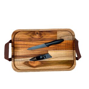 Bandeja madeira feita a mão com alças em couro e faca Preta