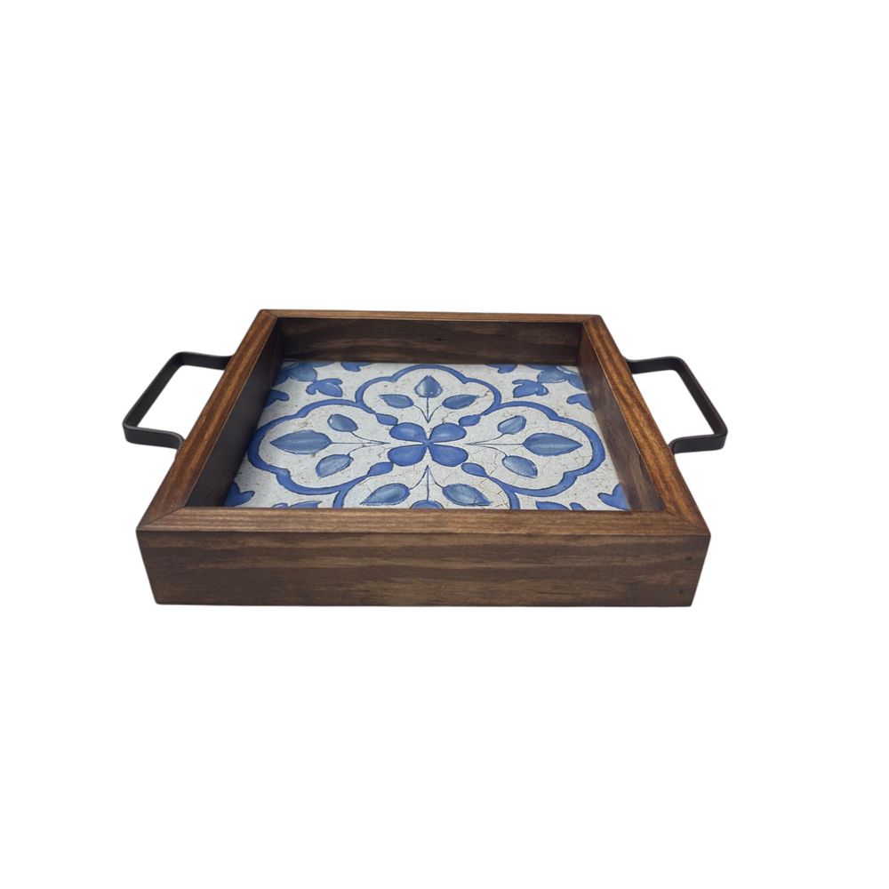 Bandeja feita mão de madeira, ferro e azulejo com detalhes Portugueses colonial.