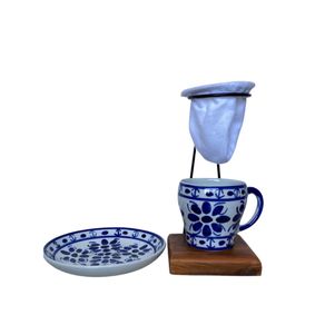 Esse kit é composto pela base madeira de demolição, coador de pano, 1 Xicara de cafezinho e 1 pires.