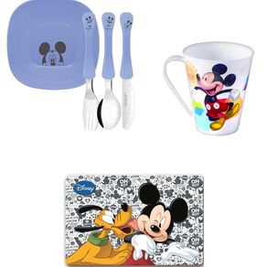 Conjunto pratinhos, talheres, jogo americano, Caneca Mickey