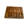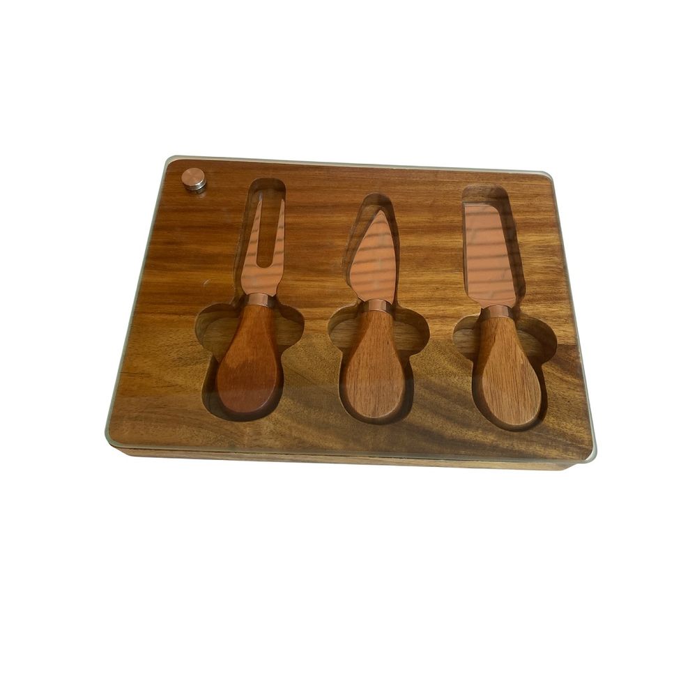 Conjunto em Madeira Acácia com utensilios em Inox e cabo de Acacia e tampa em vidro.