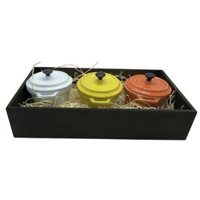 Panelinhas Amarela, Branca, Laranja de Porcelana com Bandeja rustica